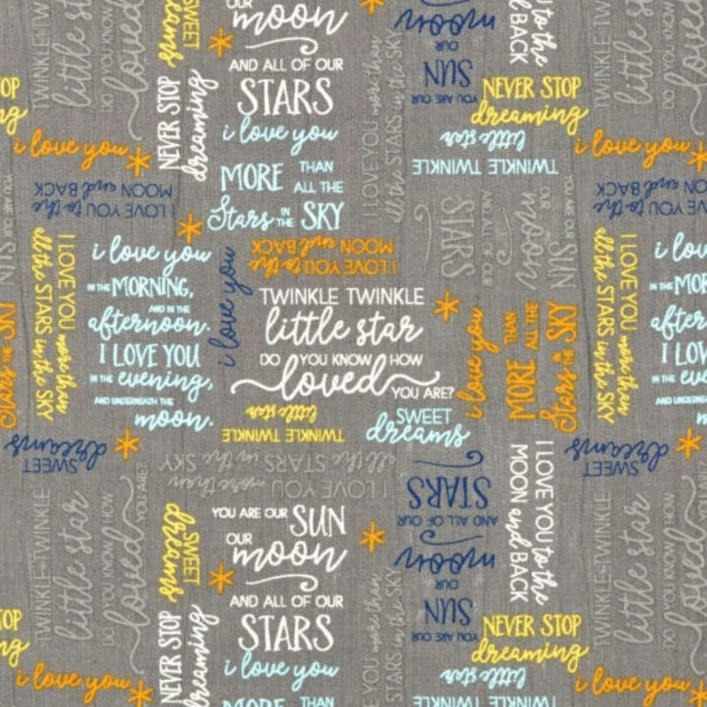All Our Stars Words Grey 82583-994 By Wilmington Prints. This fabric features colorful words like “I love you to the moon and back” on repeat on a grey background.
