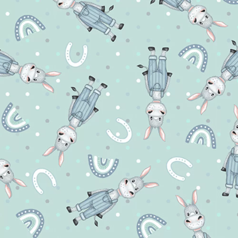 Boho Buddies Donkey Teal 1722-16 by Henry Glass Fabrics. This cotton fabric features tossed rainbows & donkeys on a light teal background.