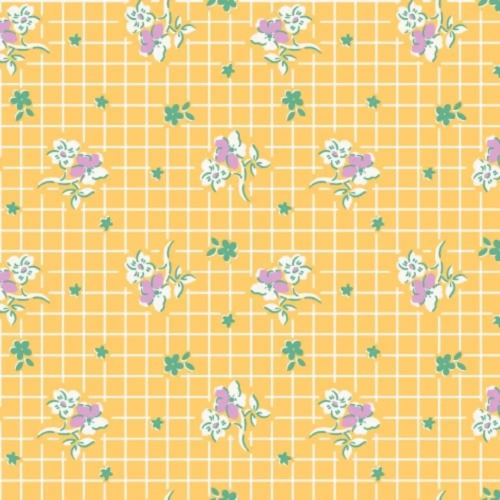 Dilly Dally Floral Grid Yellow MAS10782-S By Maywood Studio. This cotton fabric features a repeat 1930s floral grid design on a light yellow mustard background.