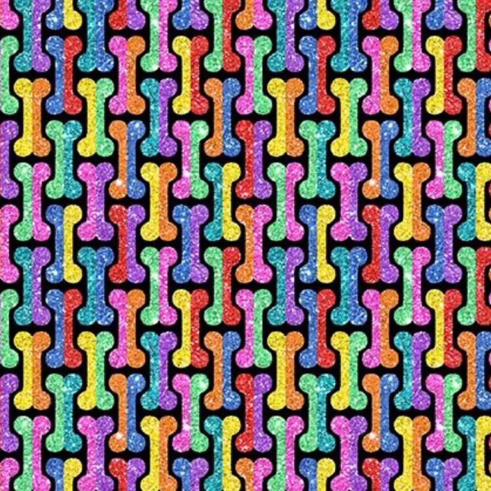 Diva Pups Bones Black 1744-99 By Henry Glass Fabrics. This cotton fabric features glitter colored bones on repeat on a black background.