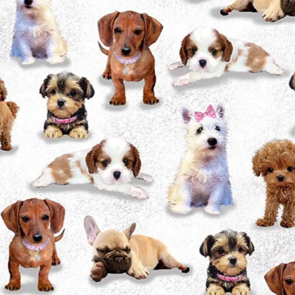Diva Pups Puppies White 1743-01 By Henry Glass Fabrics. This cotton fabric features tossed different puppies on a white background.