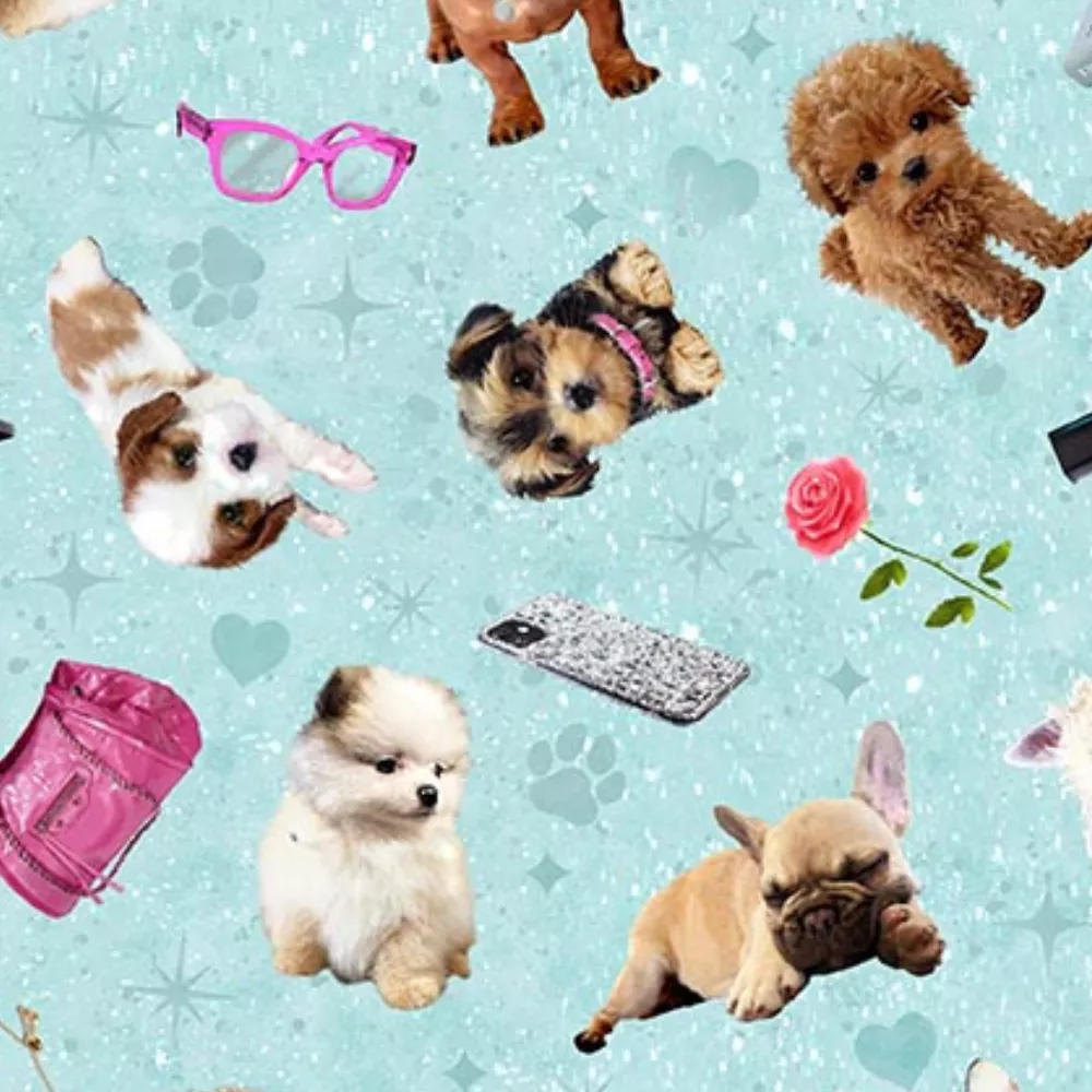 Diva Pups Tossed Puppies Aqua 1738-11 By Henry Glass Fabrics. This cotton fabric features tossed different puppies on an aqua background.