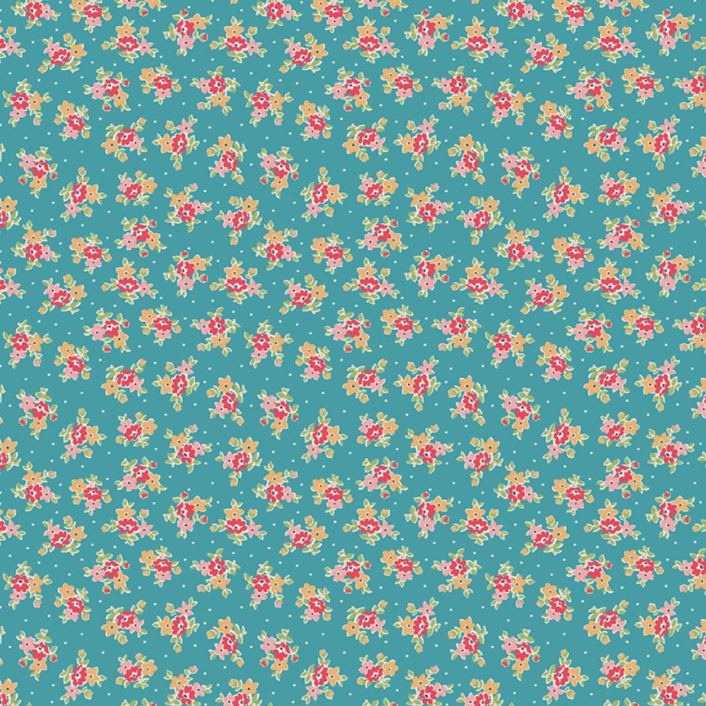 Farmer’s Daughter Bouquet Raindrop C17177-RAINDROP By Riley Blake Designs. This cotton print features scattered bouquets and pin dots on an aqua background.