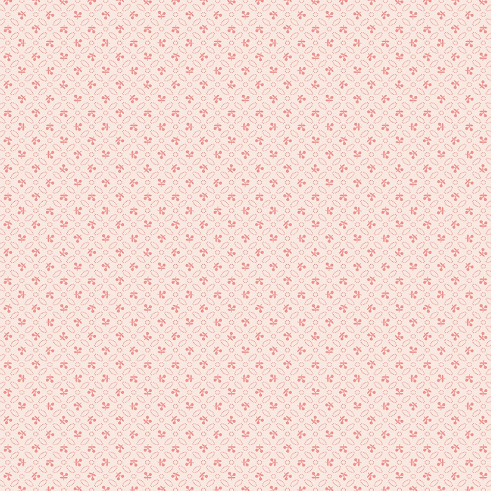 Farmer’s Daughter Cherries Background Coral C17188-CORAL By Riley Blake Designs. This cotton print features a lattice pattern with cherries in the center in coral on a light pink background.