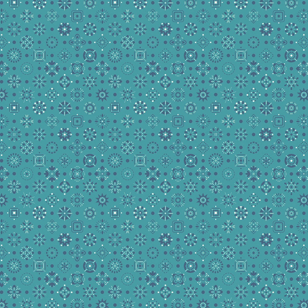 Farmer’s Daughter Handmade Raindrop C17173-RAINDROP By Riley Blake Designs. This cotton fabric features an array of geometric designs and dots, bandana, on an aqua-blue background.