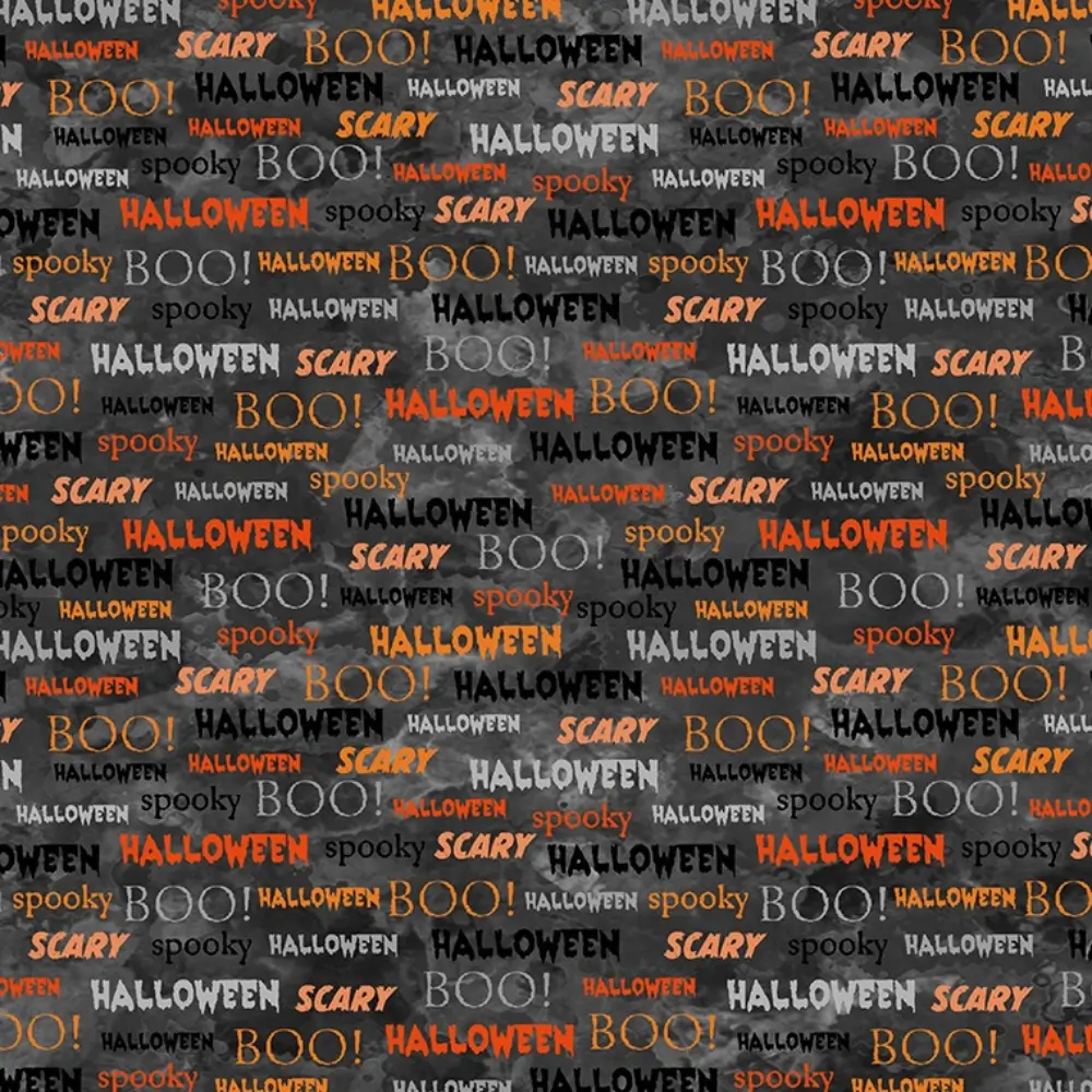 Full Moon Spooky Season Coal 54008-4 By Windham Fabrics. This fabric features Halloween words on a black background.