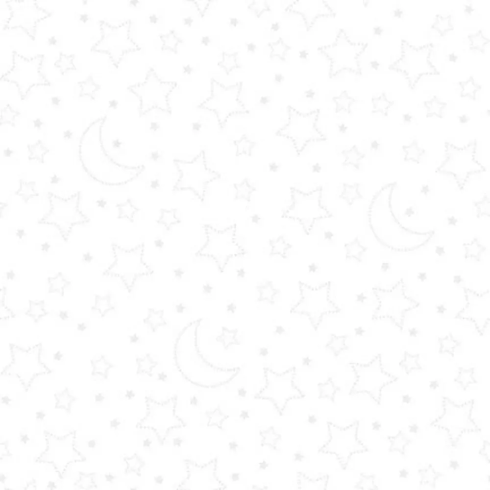 Moonlit Dreams Stars and Moons Pigment White 8030-01W By Studio E Fabrics. This cotton fabric features half moons and stars on repeat on a white background.