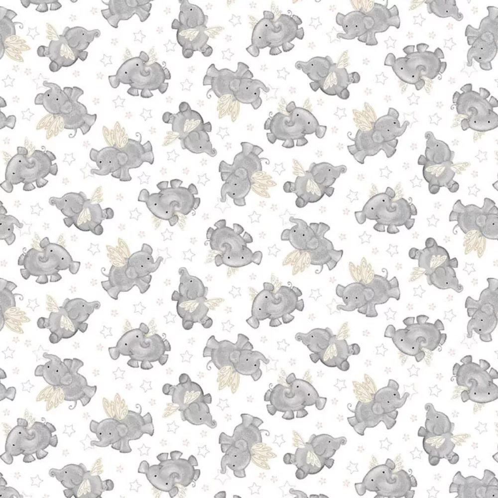 Moonlit Dreams Tossed Elephants Gray 8027-95 By Studio E Fabrics. This cotton fabric features tossed baby elephants on a white background.